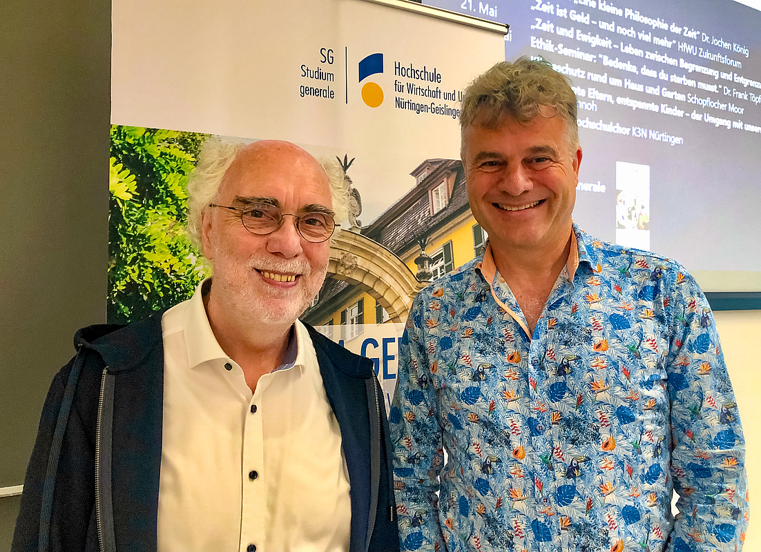 Wer die falschen Fragen stellt, bekommt keine brauchbaren Antworten. Das ist ein Problem, das Rüdiger Fox bei der KI sieht. Sie könne in dem Sinn nur falsche Fragen stellen, in dem sie immer nur rückgreifend mit bereits vorhandenen Informationen arbeite. „Aber es geht nicht darum, alte Denkmuster zu replizieren oder zu beschleunigen“, so Fox, „was wir brauchen sind ganz neue, kreative und lernende Ansätze – und das kann nur Human Intelligence“, betonte der Unternehmensberater und Krisenmanager. Mit Peter Spiegel, dem zweiten Referenten des Studium-generale-Abends in Nürtingen, teilt er die Überzeugung, dass neben technologischen Entwicklungen vor allem menschliche Kompetenzen, wie Vorstellungskraft, soziale Innovation und zukunftsfähige Kompetenzen über eine gelingende Transformation zu einer nachhaltigen Wirtschaft und Gesellschaft entscheiden.