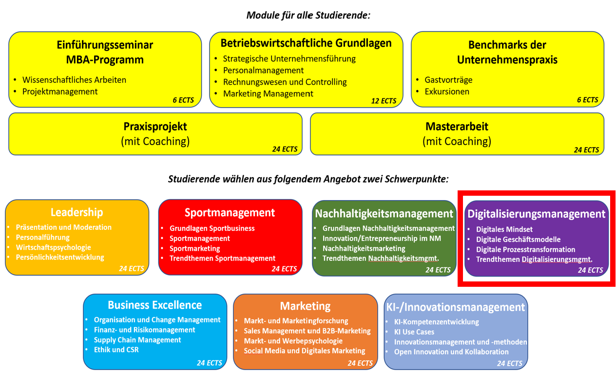 Im Schwerpunkt Digitalisierungsmanagement stehen vier Module mit insgesamt acht Vorlesungstagen auf dem Plan. Jedes Modul umfasst 6 ECTS.