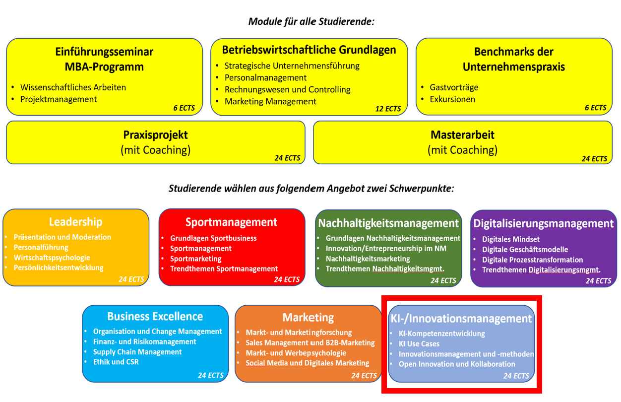 Im Schwerpunkt KI-/Innovationsmanagement stehen vier Module mit insgesamt acht Vorlesungstagen auf dem Plan. Jedes Modul umfasst 6 ECTS.