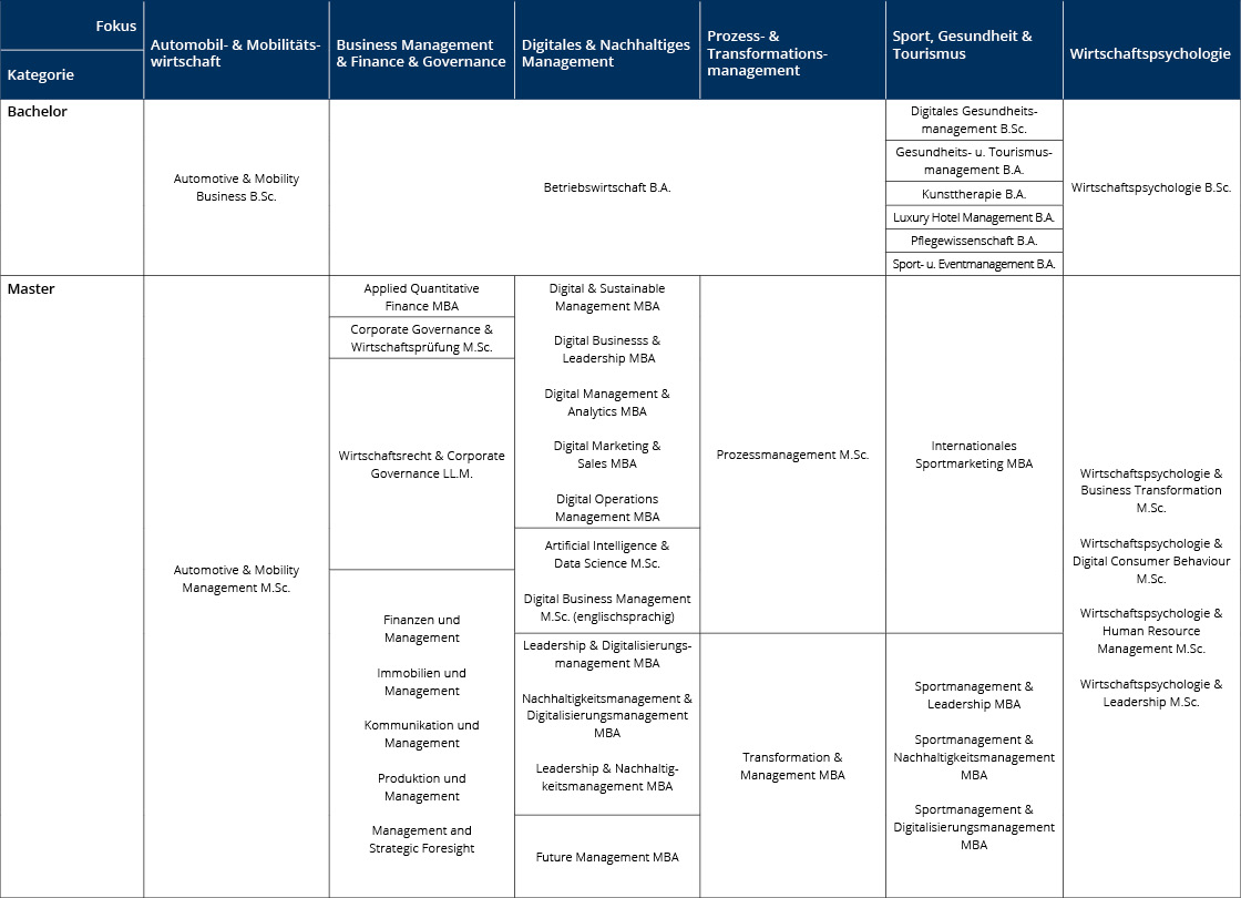 Unsere berufsbegleitenden Studienprogramme mit systemakkreditierten Abschlüssen bieten eine einzigartige Möglichkeit, Ihre Karriere voranzutreiben. Sie bilden sich umfassend weiter und entwickeln Ihre Kompetenzen. Informieren Sie sich über unsere vielfältigen Möglichkeiten in den Bereichen Bachelor, Master und MBA. Gestalten Sie aktiv Ihre berufliche Zukunft. Unsere Fachbereiche sind: Automobil- und Mobilitätswirtschaft; Business Management & Finance & Governance; Digitales & Nachhaltiges Management; Projekt-, Prozess & Transformationsmanagement; Sport, Gesundheit & Tourismus sowie Wirtschaftspsychologie.