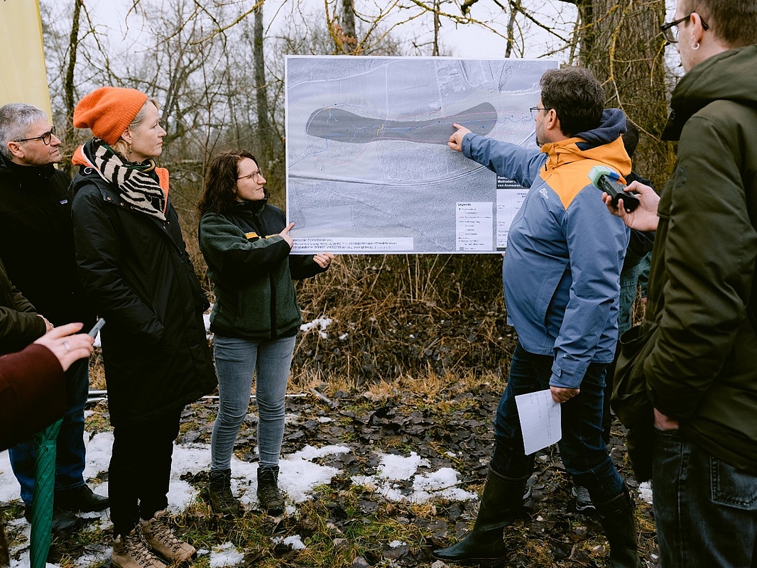 Die Gegebenheiten vor Ort erläuterte Prof. Dr. Markus Röhl, Leiter des Instituts für Landschaft und Umwelt, bei leichtem Nieselregen auf einer der drei Projektflächen. Das Kugelmoos sowie das angrenzende Salinenmoos sollen mit Geldern aus dem Klimafonds im Lauf des Jahres wiedervernässt werden. Hierfür werden von den Projektmitarbeiterinnen des ILU die notwendigen Grundlagendaten erhoben und eine Wiedervernässungskonzeption erstellt. Nach bisherigen Prognosen können mit den geplanten Maßnahmen 2.800 t CO2eq. über 80 Jahre hinweg eingespart werden.