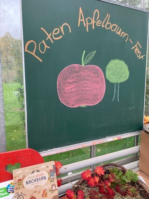 - gemeinsamer Spaziergang zum Paten-Apfelbaum (bitte an robustes Schuhwerk denken und ggfs. eine Tragehilfe oder Matschkleidung für die Kinder)
