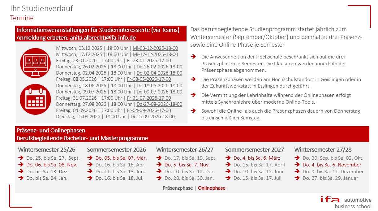 - Umsetzung: Sowohl die Präsenz- als auch die Onlinephasen finden donnerstags bis samstags statt. Die Klausuren werden innerhalb der Präsenzphasen abgenommen. Eine separate Prüfungsphase existiert daher nicht