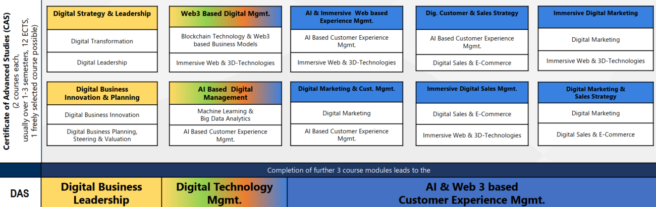 Die Digital Business School bietet drei Vertiefungsrichtungen für das berufsbegleitende Diploma of Advanced Studies (DAS) auf Master-Niveau an. Der Einstieg ist zulassungsfrei.