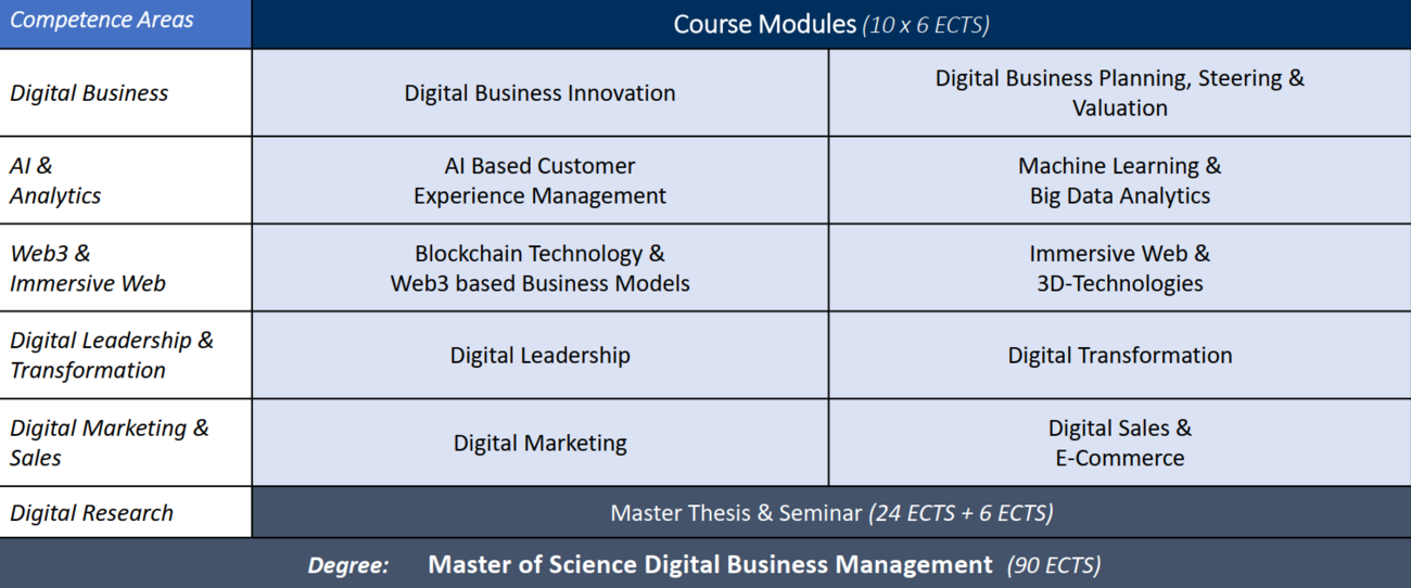 Von den fünf vorgesehenen Modulen im jeweiligen Diploma-Studiengang kannst Du ein externes Modul aus dem Curriculum des M.Sc. Digital Business Management frei wählen. Dieses ersetzt dann ein Modul Deiner gewählten Diploma-Vertiefung.