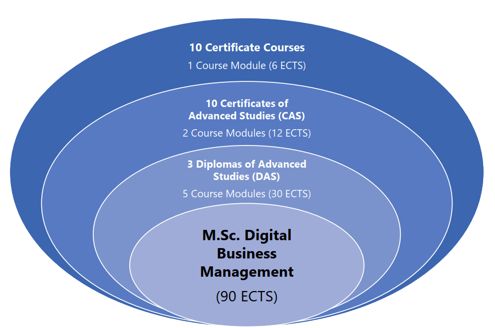 Neben dem zur Promotion berechtigenden Master of Science, können auch die Weiterbildungsabschlüsse Diploma of Advanced Studies (DAS), Certificate of Advanced Studies (CAS) und einzelne Zertifikate absolviert werden.