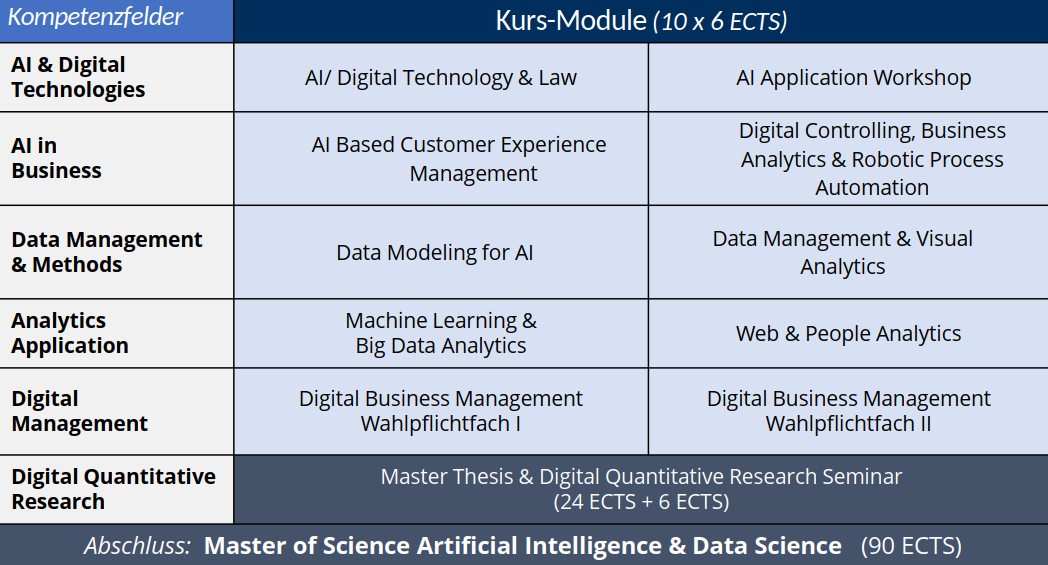 Der Master of Science (90 ECTS) vermittelt praxisorientiertes Fachwissen in den Bereichen Künstliche Intelligenz, Datenanalyse, Machine Learning, Data Management, KI-gestützte Customer Experience, sowie digitale Unternehmensführung.