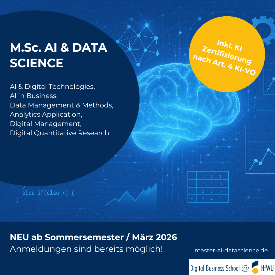 Die Digital Business School bietet den berufsbegleitenden und international anerkannten M.Sc. AI & Data Science an.