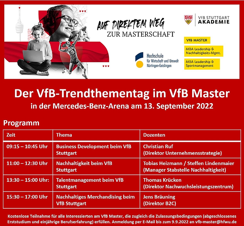 Bei der VfB Bildungsakademie handelt es sich um ein einzigartiges Bildungsnetzwerk im europäischen Profifußball. Durch die Kooperation mit dem VfB Stuttgart bieten wir den Teilnehmerinnen und Teilnehmern am VfB Master (aber auch am Power MBA) einen exklusiven Blick hinter die Kulissen eines Fußballbundesligisten. Unsere Studierenden kommen zudem in den Genuss von Karten aus dem VfB-Ticketpool sowie Einladungen zu VfB-Veranstaltungen. Zudem erhalten Sie einen exklusiven Newsletter mit internen Stellenangeboten des VfB Stuttgart.