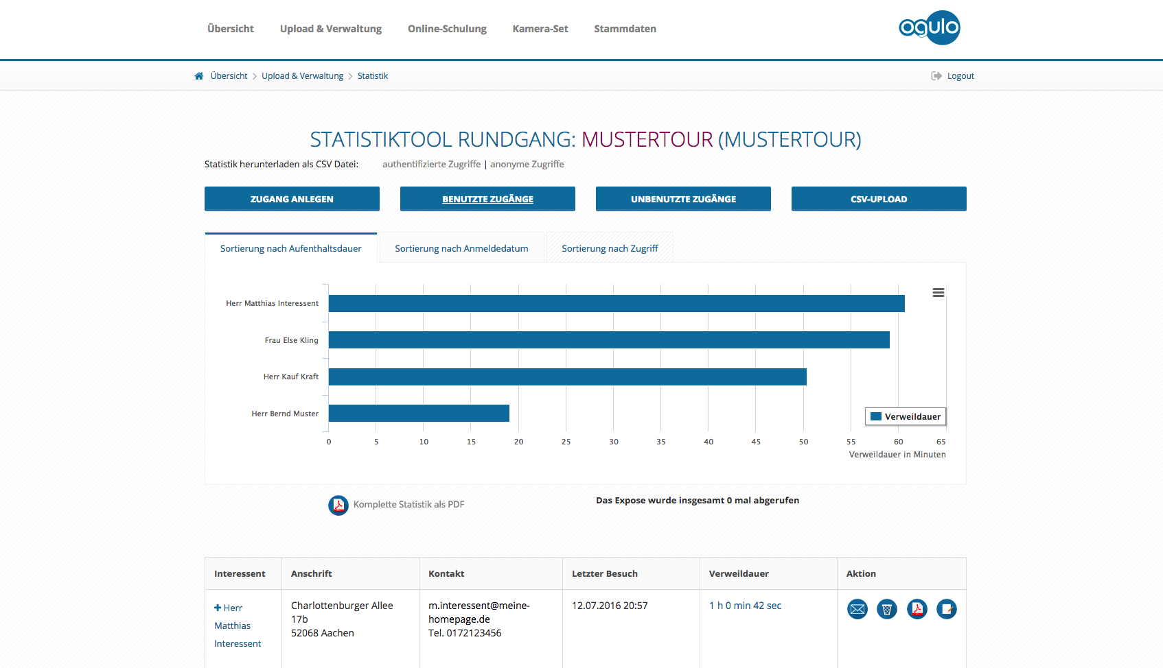 Mit dem integrierten Passwort- und Statistiktool kann der Immobilienvermittler bei der virtuellen Begehung seiner Immobilien einerseits die Privatsphäre des Bewohners schützen und andererseits nachvollziehen, wer, wie lange und wie oft sich die Immobilie in welchem Raum zu welcher Uhrzeit virtuell angeschaut hat. „Objektbesichtigungen sind für die Immobilienbranche mit einem riesigen zeitlichen Aufwand verbunden, oder anders betrachtet ein massiver Kostentreiber. Mit Ogulo kann“, so Laudator und Jurymitglied Klaus Striebich, Managing Director Leasing der ECE Projektmanagement, „der Makler erkennen wer wirklich interessiert ist und mit den zwei oder drei ‚heißen’ Kandidaten die Besichtigung machen.